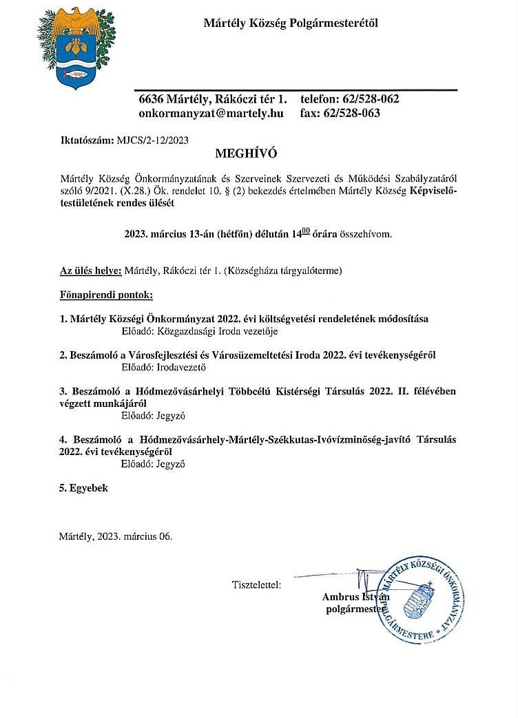 Meghívó képviselő testületi ülésre - 2023.03.13.