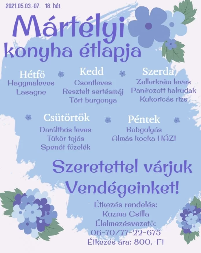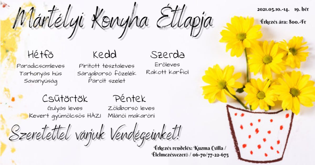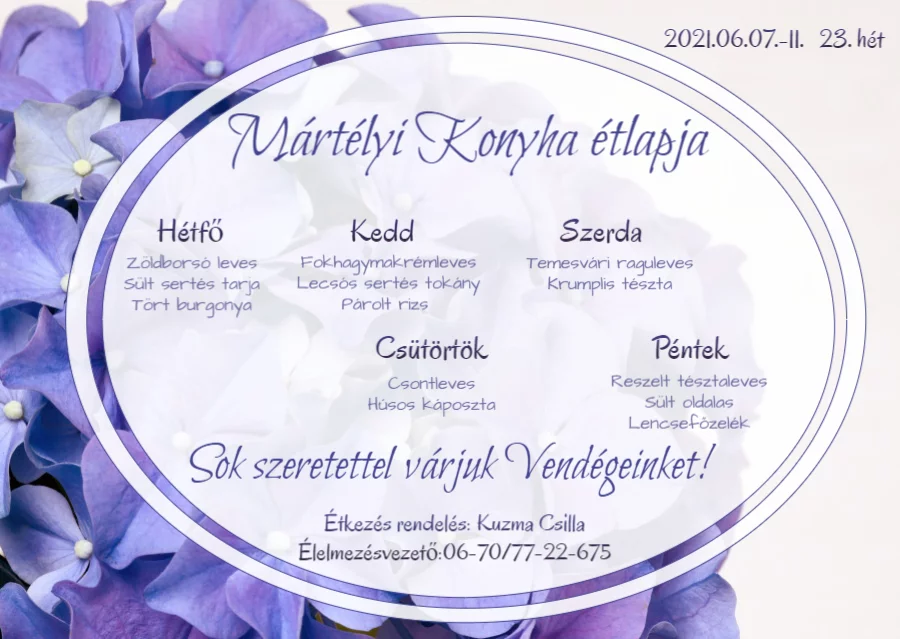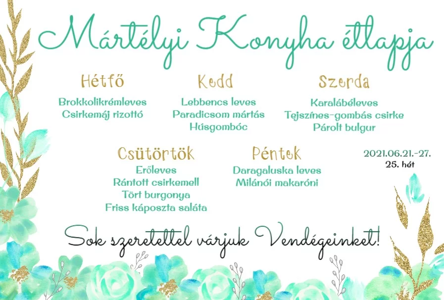Alább találja a Mártélyi Általános Művelődési Központ Szociális Konyhájának heti ajánlatait.